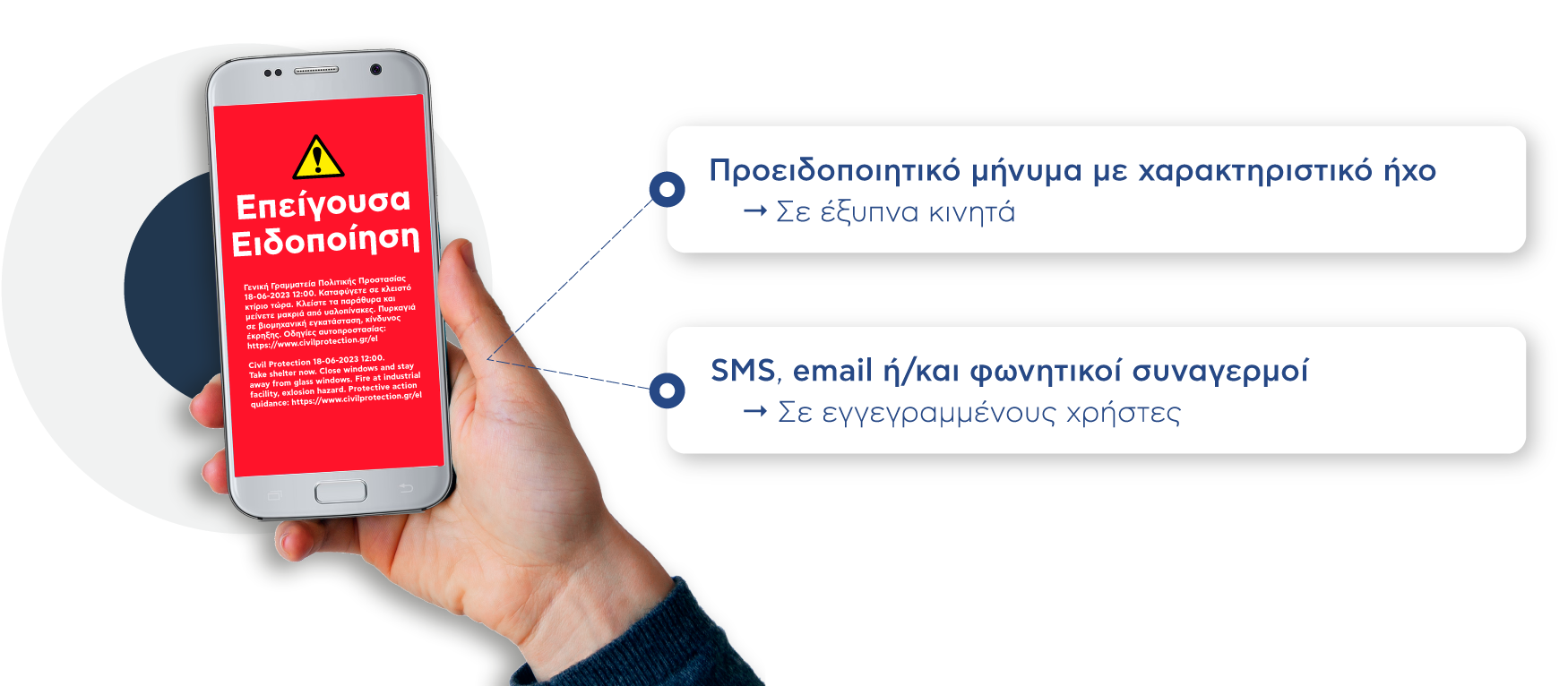 Η Γενική Γραμματεία Πολιτικής Προστασίας του Υπουργείου Κλιματικής Κρίσης και Πολιτικής Προστασίας, σε περιπτώσεις έκτακτης ανάγκης ή επικίνδυνων φαινομένων ή συμβάντων, ειδοποιεί τους πολίτες προκειμένου να διασφαλιστεί η προστασία τους.
