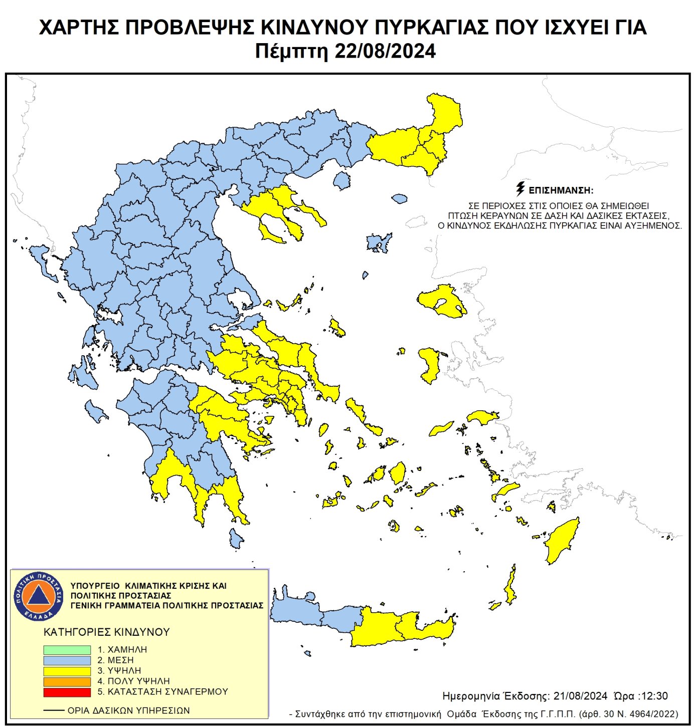 Ημερήσιος Χάρτης Πρόβλεψης Κινδύνου Πυρκαγιάς για 22/08/2024