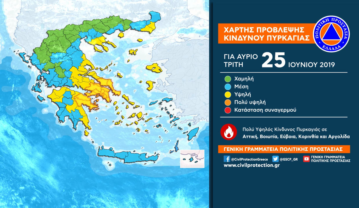 Πολύ υψηλός κίνδυνος πυρκαγιάς (κατηγορία κινδύνου 4) για αύριο Τρίτη 25 Ιουνίου 2019