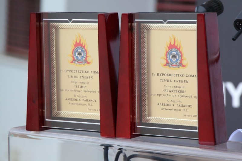 Στο τέλος της τελετής, ο Υφυπουργός Κλιματικής Κρίσης και Πολιτικής Προστασίας Ευάγγελος Τουρνάς και ο Αρχηγός του Πυροσβεστικού Σώματος Αντιστράτηγος Αλέξιος Ράπανος επέδωσαν αναμνηστικές πλακέτες στον Εμπορικό Διευθυντή της Praktiker Hellas Δημήτρη Μάγκο και στον Διευθύνοντα Σύμβουλο της Stihl Ηλία Ραβάνη.