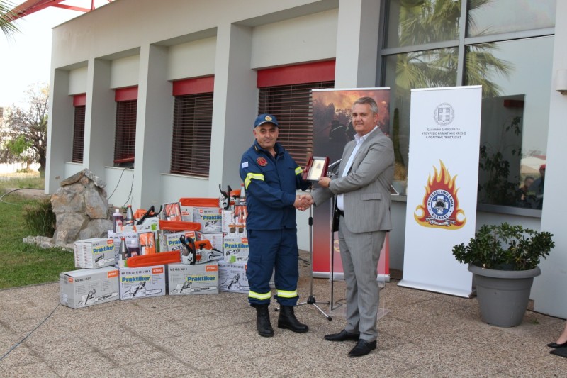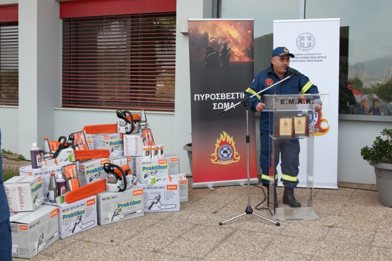 Παρουσία του Υφυπουργού Κλιματικής Κρίσης και Πολιτικής Προστασίας Ευάγγελου Τουρνά, του Αρχηγού Πυροσβεστικού Σώματος Αντιστράτηγου Αλέξιου Ράπανου, του Εμπορικού Διευθυντή της Praktiker Hellas, Δημήτρη Μάγκου και του Διευθύνοντα Συμβούλου της Stihl Ηλία Ραβάνη, πραγματοποιήθηκε εχθές, η τελετή δωρεάς εκατόν εβδομήντα πέντε (175) αλυσοπρίονων αξίας 110.000 ευρώ στο Πυροσβεστικό Σώμα, για την κάλυψη των υπηρεσιακών του αναγκών, στις εγκαταστάσεις της 1ης Ε.Μ.Α.Κ, στην Ελευσίνα Αττικής.