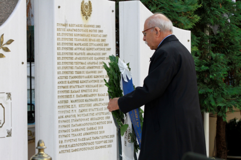 Στη συνέχεια πραγματοποιήθηκε προσκλητήριο πεσόντων και κατάθεση στεφάνων στο Μνημείο Πεσόντων Πυροσβεστών, από τον Υπουργό Κλιματικής Κρίσης και Πολιτικής Προστασίας Χρήστο Στυλιανίδη, τον Υφυπουργό Ευάγγελο Τουρνά, τον Γενικό Γραμματέα Πολιτικής Προστασίας Βασίλειο Παπαγεωργίου, τον Υπαρχηγό του Πυροσβεστικού Σώματος Αντιστράτηγο Ιωάννη Πετρούτσο, από συγγενείς των πεσόντων, από εκπρόσωπους, των συνδικαλιστικών οργανώσεων, του Π.Σ., των πυροσβεστών πενταετούς υποχρέωσης, των συμβασιούχων πυροσβεστών, των εθελοντών πυροσβεστών, του συλλόγου πολιτικού προσωπικού του Π.Σ. και των ενώσεων αποστράτων Π.Σ.