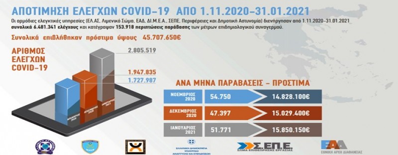 Το διάστημα Νοεμβρίου 2020 - Ιανουαρίου 2021 πραγματοποιήθηκαν 6.481.341 έλεγχοι και κατεγράφησαν 153.918 παραβιάσεις των μέτρων περιορισμού της διασποράς του SARS-CoV-2. Επιβλήθηκαν δε οικονομικές κυρώσεις συνολικού ύψους 45.707.650€.