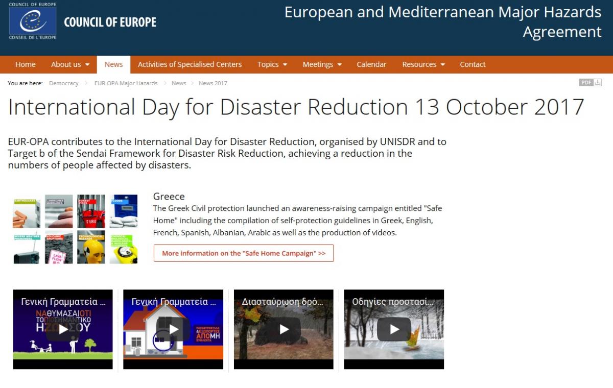 Το Συμβούλιο της Ευρώπης και συγκεκριμένα η Ανοιχτή Μερική Συμφωνία για την Αντιμετώπιση Μεγάλων Καταστροφών (EUR-OPA Major Hazards Agreement) της οποίας μέλος είναι και η χώρα μας επέλεξε για τη σημερινή Διεθνή Ημέρα για τη Μείωση των Καταστροφών να συμπεριλάβει στις εορταστικές τις αναρτήσεις δράσεις της Ελλάδας και του Βελγίου, ως εξέχοντα παραδείγματα που υλοποιούν με τον καλύτερο τρόπο τους στόχους του Πλαισίου του Sendai για τη Μείωση του Κινδύνου Καταστροφών (Sendai Framework for Disaster Risk Reduction 2015 – 2030).