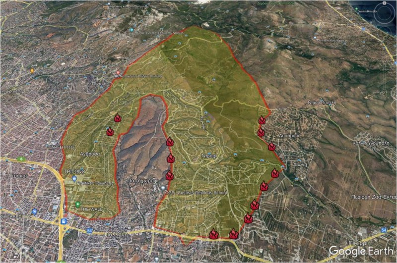 Ο σκιαγραφημένος χάρτης που φαίνεται στους δέκτες σας, αποτυπώνει την κατάσταση, όπως αυτή τη στιγμή εξελίσσεται, στην πυρκαγιά της Πεντέλης.