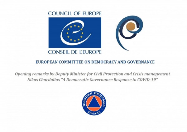 Ο Υφυπουργός Πολιτικής Προστασίας και Διαχείρισης Κρίσεων, Νίκος Χαρδαλιάς συμμετείχε, μέσω τηλεδιάσκεψης, στη συνεδρίαση Υψηλού Επιπέδου της Επιτροπής για την Δημοκρατία και τη Διακυβέρνηση του Συμβουλίου της Ευρώπης υπό την τρέχουσα Ελληνική Προεδρία. Θέμα της συνεδρίασης ήταν η “Αντιμετώπιση του Κορωνοιού στο πλαίσιο μιας Δημοκρατικής Διακυβέρνησης – Α Democratic Governance Response to COVID-19”.