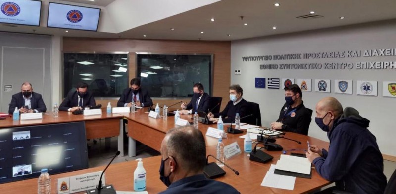 Ολοκληρώθηκε η ευρεία σύσκεψη υπό τον Υπουργό Προστασίας του Πολίτη, Μιχάλη Χρυσοχοΐδη και τον Υφυπουργό Πολιτικής Προστασίας και Διαχείρισης Κρίσεων, Νίκο Χαρδαλιά, παρουσία του Αναπληρωτή Υπουργού Εσωτερικών αρμόδιου για θέματα Αυτοδιοίκησης, Στέλιου Πέτσα, του Υφυπουργού παρά τω Πρωθυπουργώ στον Υπουργό Επικρατείας, Θεόδωρου Λιβάνιου και του Κυβερνητικού Εκπροσώπου, Χρήστου Ταραντίλη, που πραγματοποιήθηκε σήμερα στο Κέντρο Επιχειρήσεων της Πολιτικής Προστασίας (κτίριο Φάρος). Αντικείμενο της σύσκεψης αποτέλεσε η προετοιμασία του κρατικού μηχανισμού ενόψει της έντονης κακοκαιρίας που αναμένεται να πλήξει τη χώρα κατά τις επόμενες ημέρες και επιβεβαιώθηκε ο πλήρης συντονισμός όλων των συναρμόδιων φορέων Πολιτικής Προστασίας, καθώς και η επιχειρησιακή τους ετοιμότητα.