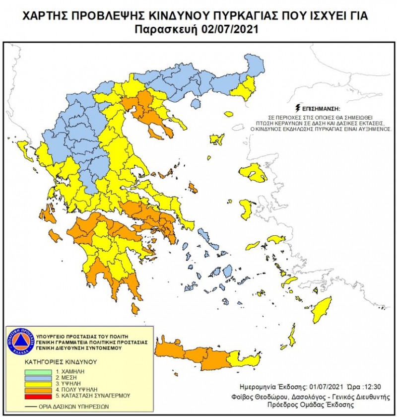 Σύμφωνα με το Χάρτη Πρόβλεψης Κινδύνου Πυρκαγιάς που εκδίδει η Γενική Γραμματεία Πολιτικής Προστασίας του Υπουργείου Προστασίας του Πολίτη (www.civilprotection.gr), για αύριο Παρασκευή 02 Ιουλίου 2021, προβλέπεται πολύ υψηλός κίνδυνος πυρκαγιάς (κατηγορία κινδύνου 4) για τις εξής περιοχές: