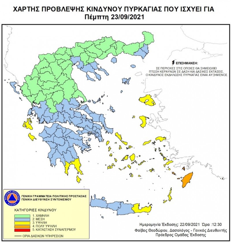 Σύμφωνα με το Χάρτη Πρόβλεψης Κινδύνου Πυρκαγιάς που εκδίδει η Γενική Γραμματεία Πολιτικής Προστασίας του Υπουργείου Προστασίας του Πολίτη (www.civilprotection.gr), για αύριο Πέμπτη 23 Σεπτεμβρίου 2021, προβλέπεται πολύ υψηλός κίνδυνος πυρκαγιάς (κατηγορία κινδύνου 4) για τις εξής περιοχές: