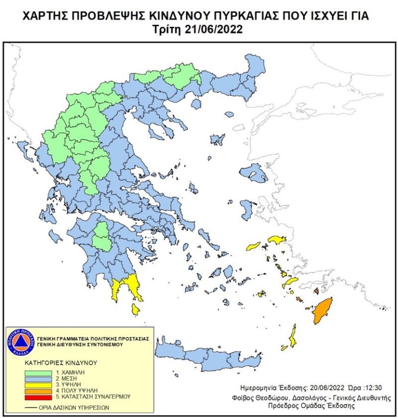 Σύμφωνα με το Χάρτη Πρόβλεψης Κινδύνου Πυρκαγιάς που εκδίδει η Γενική Γραμματεία Πολιτικής Προστασίας του Υπουργείου Κλιματικής Κρίσης & Πολιτικής Προστασίας (www.civilprotection.gr), για αύριο Τρίτη 21 Ιουνίου 2022, προβλέπεται πολύ υψηλός κίνδυνος πυρκαγιάς (κατηγορία κινδύνου 4) για τις εξής περιοχές: