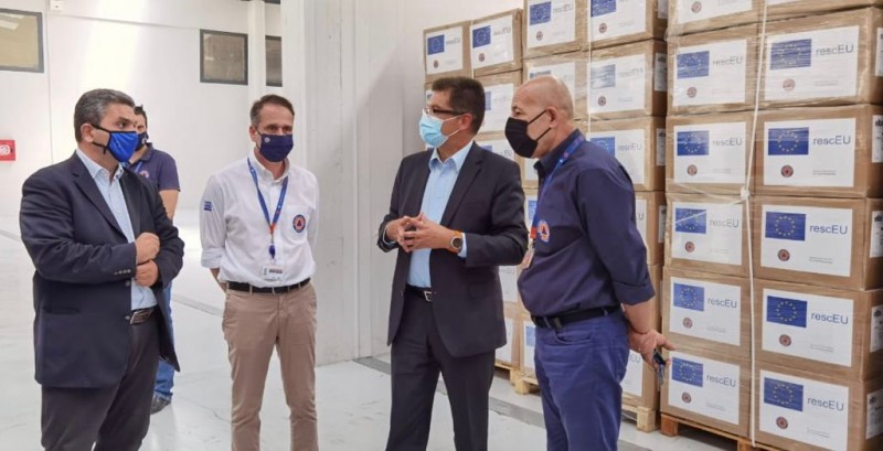 Ο κ. Lenarčič επισκέφθηκε επίσης, συνοδευόμενος από τον Γενικό Γραμματέα Πολιτικής Προστασίας, Βασίλη Παπαγεωργίου, τις εγκαταστάσεις της Πολιτικής Προστασίας στον Αυλώνα Αττικής, όπου στεγάζεται μέρος του ευρωπαϊκού κοινού αποθεματικού για ιατρικό υλικό ζωτικής σημασίας προς κάλυψη αναγκών που σχετίζονται με τη διαχείριση της πανδημίας (RescEU stockpiling).