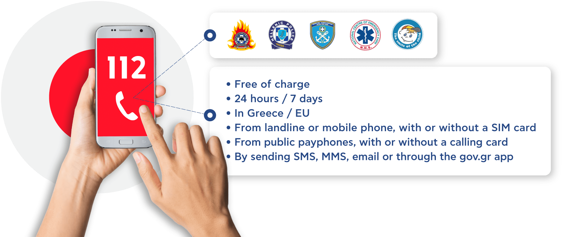 Phone calls are answered immediately by specially trained operators. In addition, the 112 call center is staffed with representatives of the competent emergency service providers (Hellenic Police, Hellenic Fire Service, Hellenic Coastguard, National Center for Emergency Care - EKAV).