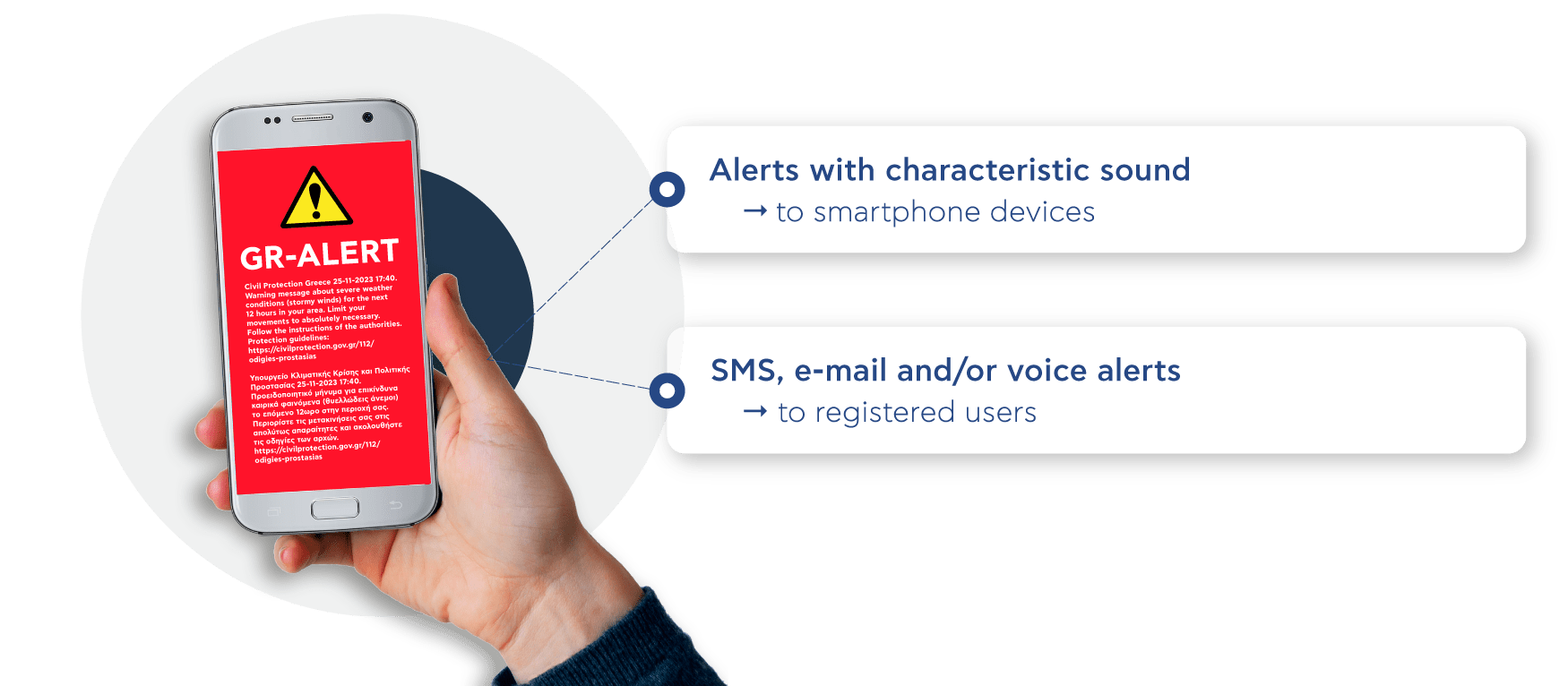 The General Secretariat for Civil Protection of the Ministry for Climate Crisis and Civil Protection, alerts citizens in cases of emergency or dangerous phenomena or incidents, in order to ensure their protection.