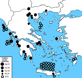 Περιοχές που σημειώθηκαν ανεμοστρόβιλοι (σίφωνες ξηράς) και σίφωνες θάλασσας στο διάστημα 2000-02 (Μ. Σιούτας)